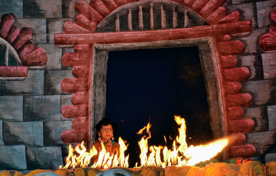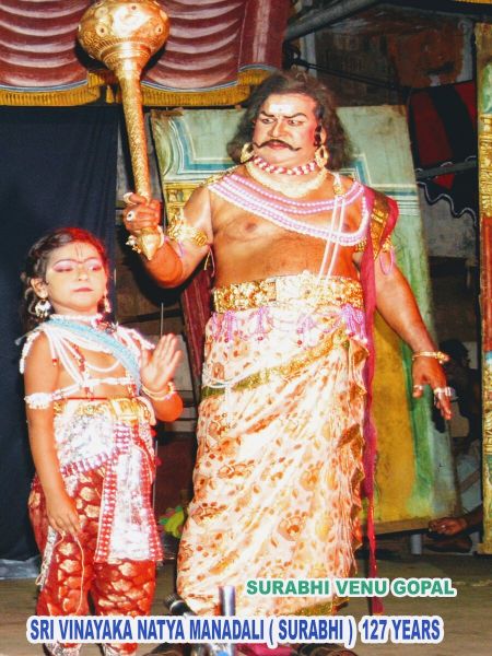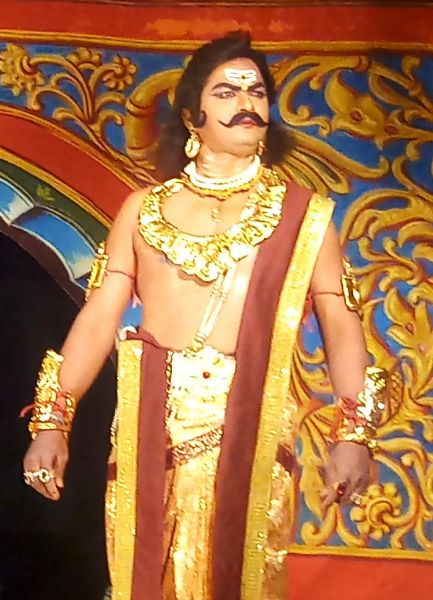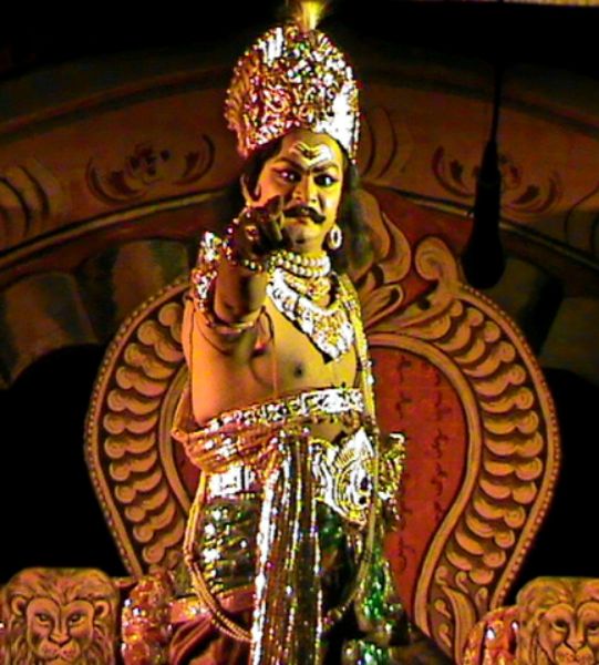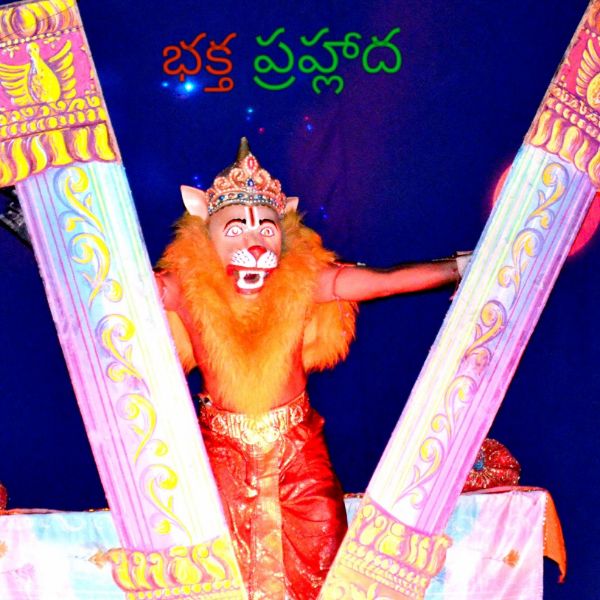 One day, got sick with the arguments with his son, Hiranyakashyapa asks his son Prahlada to show Lord Vishnu if the Lord has courage enough to face him. Prahlada relies in a different manner that one can find Lord Vishnu anywhere and everywhere since he is omnipresent. The enraged Hiranyakashyapa compels Prahlada to show his Lord in a pillar and breaks it with his mace. From the broken Pillar, miraculously, Narasimhavathara, the incarnation Human Lion comes out. Narasimha lifts Hiranyakashyapa, places the king him on his lap on the threshold, at sunset and kills Hiranyakashyapa with his nails pierching into stomach.